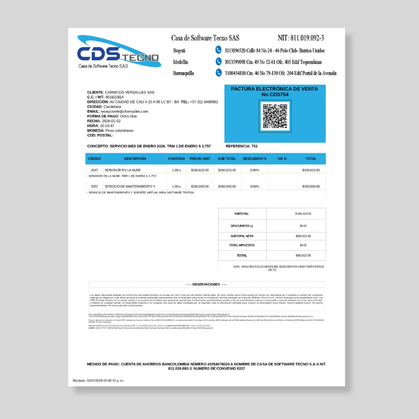 La facturación electrónica (emisión), recepción de documentos y la nómina electrónica son procesos clave para el cumplimiento normativo y el control financiero de las empresas. En Casa de Software Tecno implementamos soluciones electrónicas alineadas con la normativa vigente de la DIAN, asegurando que cada documento se emita de forma correcta, segura y acorde a la operación real del negocio.